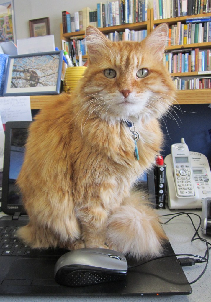But now, since the beginning of the year, I have seen a change in our fluffy orange guy. He has turned 13, the beginning of the senior years in a cat. Monty is sleeping more. He has lost a lot of weight. Five pounds I think. His backbone is sticking up and his sides are a bit sunk in. We know he is experiencing some arthritis. Sometimes when people pet him a little too hard I see a reaction. Maybe it hurts. So I try to provide more guidance for the customers.