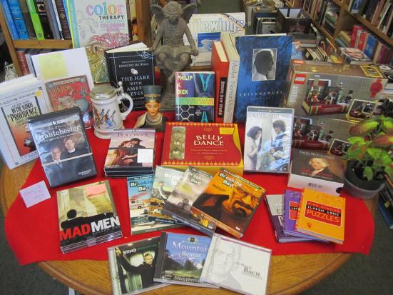 That’s what my sign says. Here is a peek at some of the “and more” that we have in the store this holiday season: TV mini-series, music CDs, books on CD, books on cassettes (really!), coloring books, a Charles Dickens Lego set, mugs, movies, statues, and plants…always have plants for sale. Not pictured: framed art and prints, and collectible Harry Potter stuffed critters. Stop by and see what’s new.