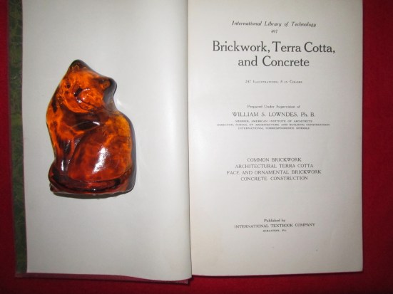 Just in at The Eclectic Reader – a real find for the architect doing restoration work on pre- 1920s buildings. This is the International Library of Technology 497 “Brickwork, Terra Cotta, and Concrete” prepared under the supervision of William S. Lowndes, published in 1920. 247 illustrations. $45. Only 4 copies online. This is a beautiful copy.