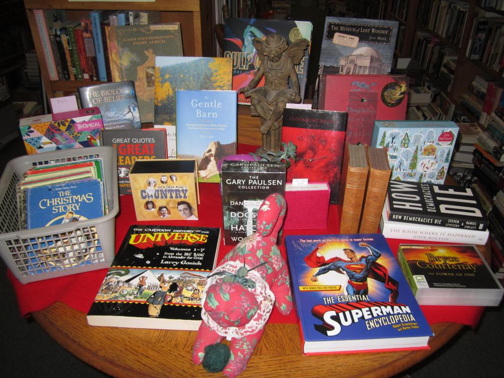 We are well stocked with a variety of books for all ages. The extras include puzzles, CDs, DVDs, and a few flea market items.