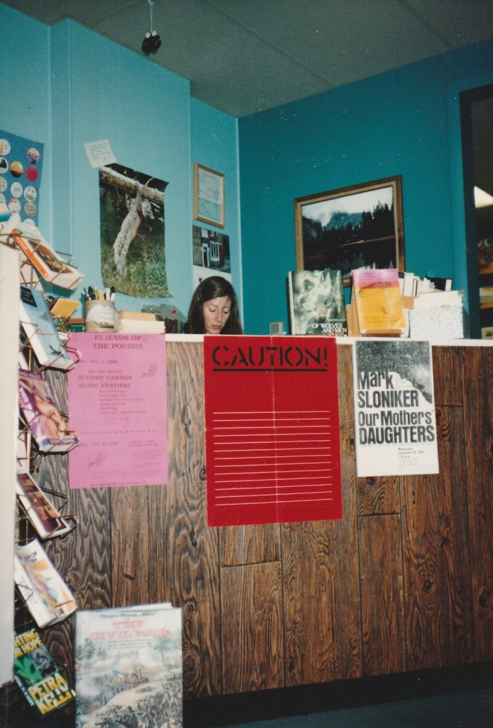 During the short two years at this location I became increasingly involved in banned book week. I joined up with Pat Hartman, local artist, writer, publisher of Salon zine, and an all-around creative who was organizing a read-in for banned book week in 1989. I supplied books for the event. We sold buttons she designed. We sat outside The Stone Lion bookstore with our display, which included a trash can with banned books and cardboard flames. The Stone Lion got all the publicity and we did all the work. The community participated by picking out a banned book and walking around reading it outloud like the “book people” in Farenheit 451.